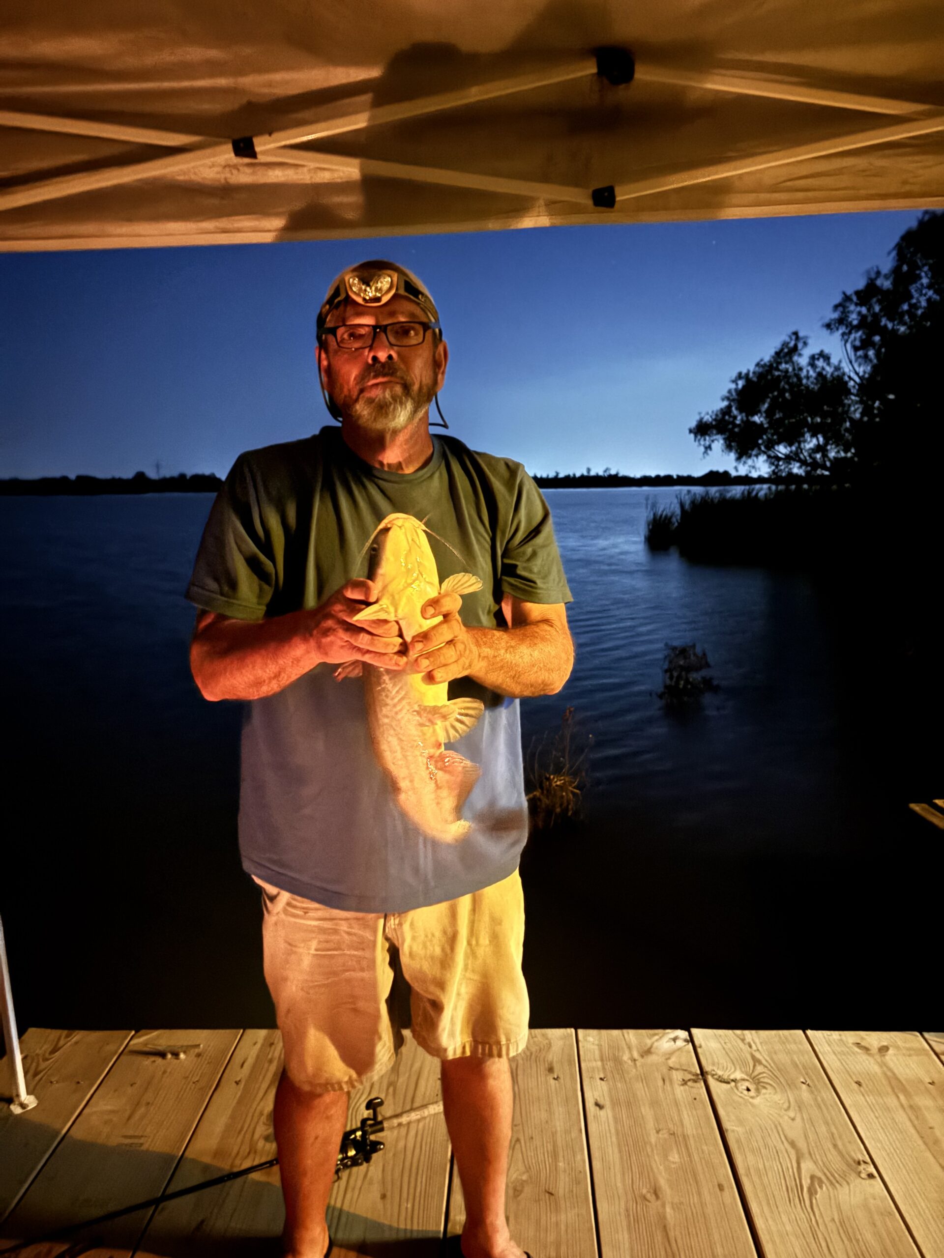 Sitting on the front porch of the house boat, fishing for Catfish.