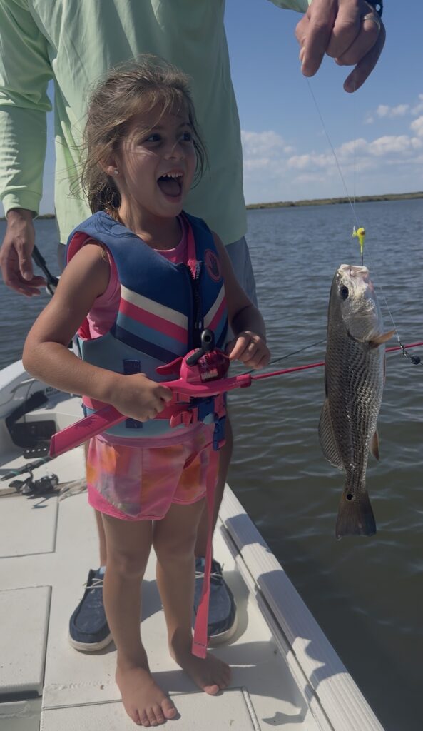 Five years old, tiny pink rod in hand, and a heart bigger than the bay. On this day she reeled in her very first redfish. The squeals, the happy dance, and the proud grin said it all… our fishing buddy was hooked for life.