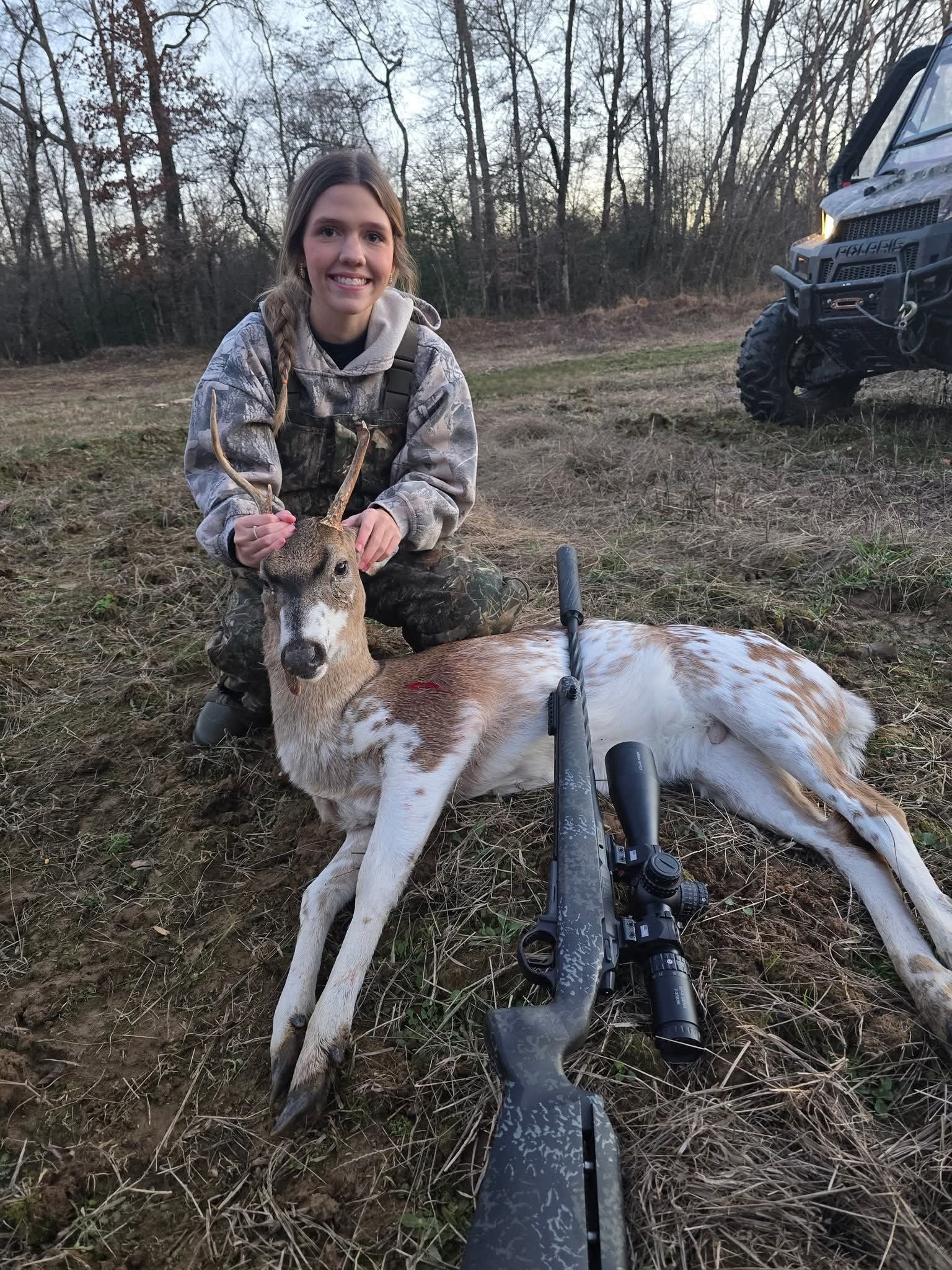 Annalise Taylor, my 15 year old daughter killed her Piebald buck in North West Alabama with her Seekins 6mm Creedmoor at 210 yards.